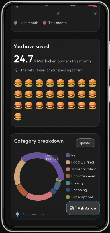 Arrow is a personal finance management app that allows user to track transactions, create and maintain budgets & achieve financial goals with the help of AI.