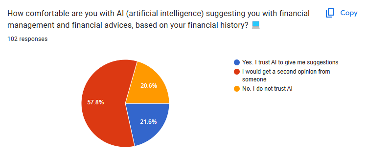 To add on, according to my survey of 102 people, the majority of them did not prefer AI taking decision and doing financial activity.